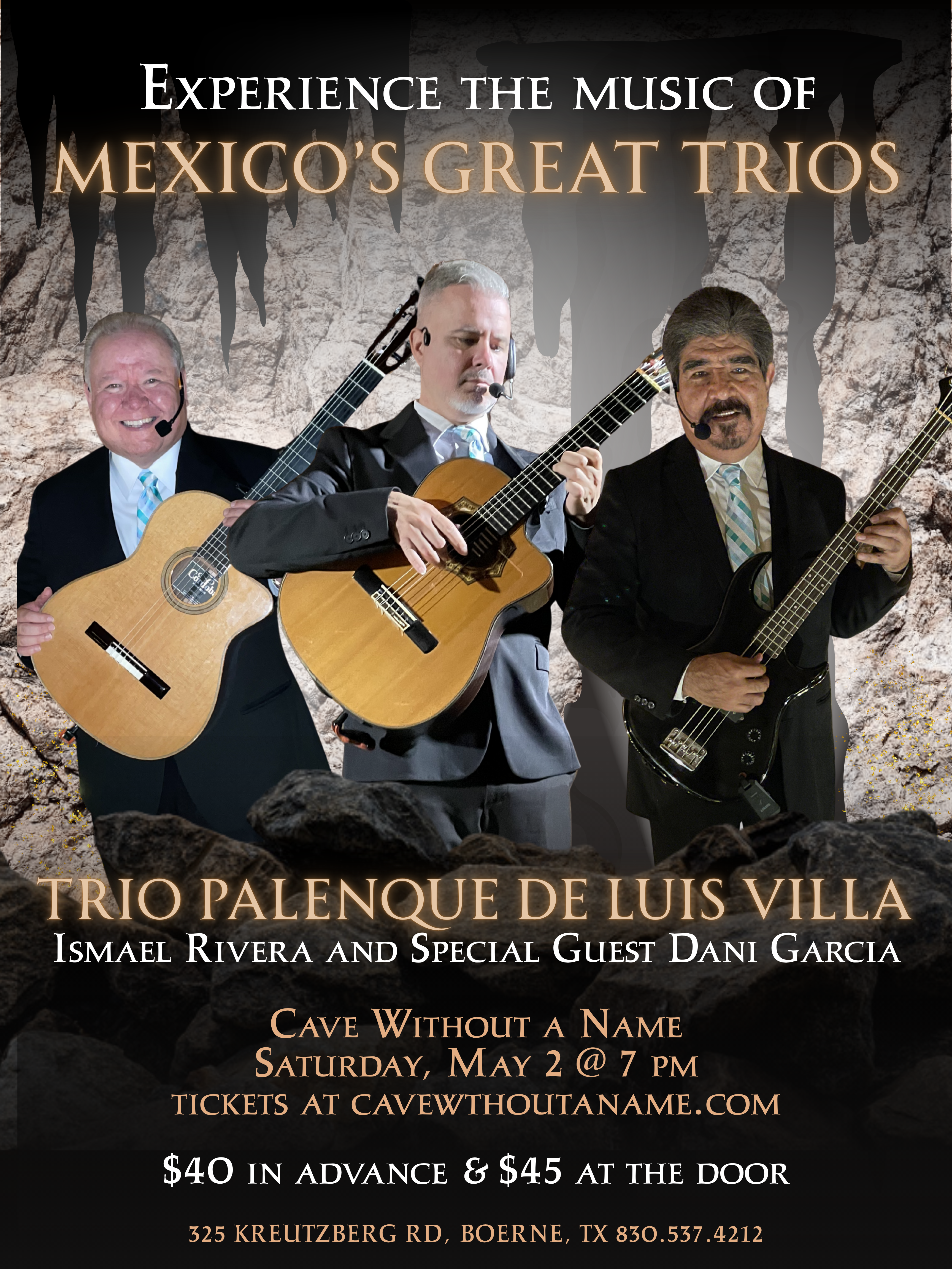All tickets will be will-call on show day. Alternatively, call the cave at 830.537.4212 to purchase tickets by phone.